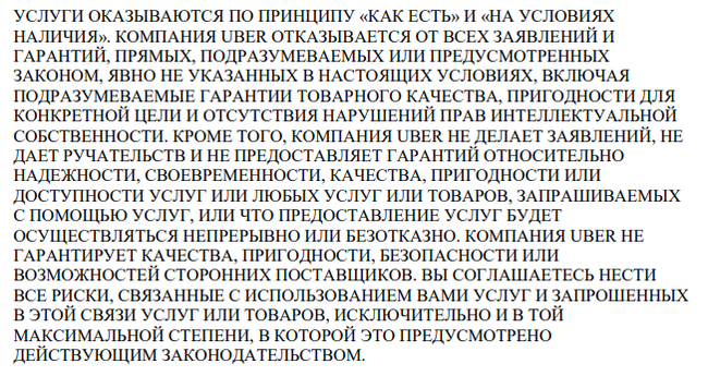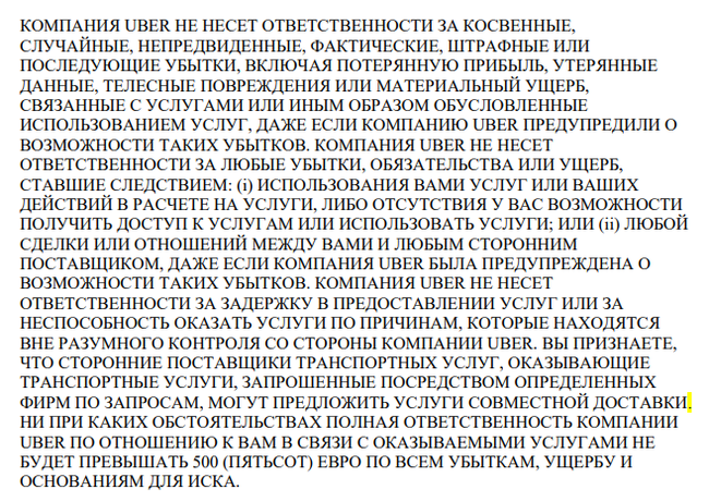В декабре прошлого года Европейский суд признал Uber транспортной компанией. Это решение Европейского суда не может быть обжаловано. Оно распространяется на все 28 стран-членов ЕС и грозит Uber более жестким регулированием ведения бизнеса, повышением налогов и изменениями в требованиях к водителям. Но только не для России. Вот выдержки из Условий предоставляемых услуг. https://support-uber.com/tosRU