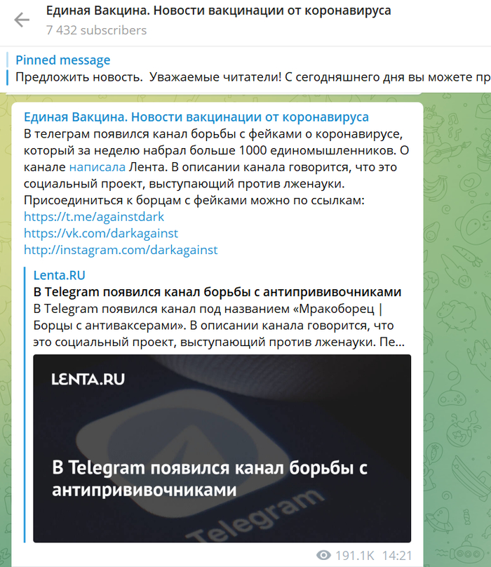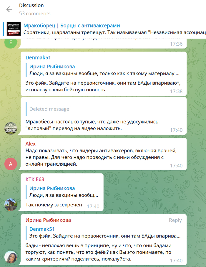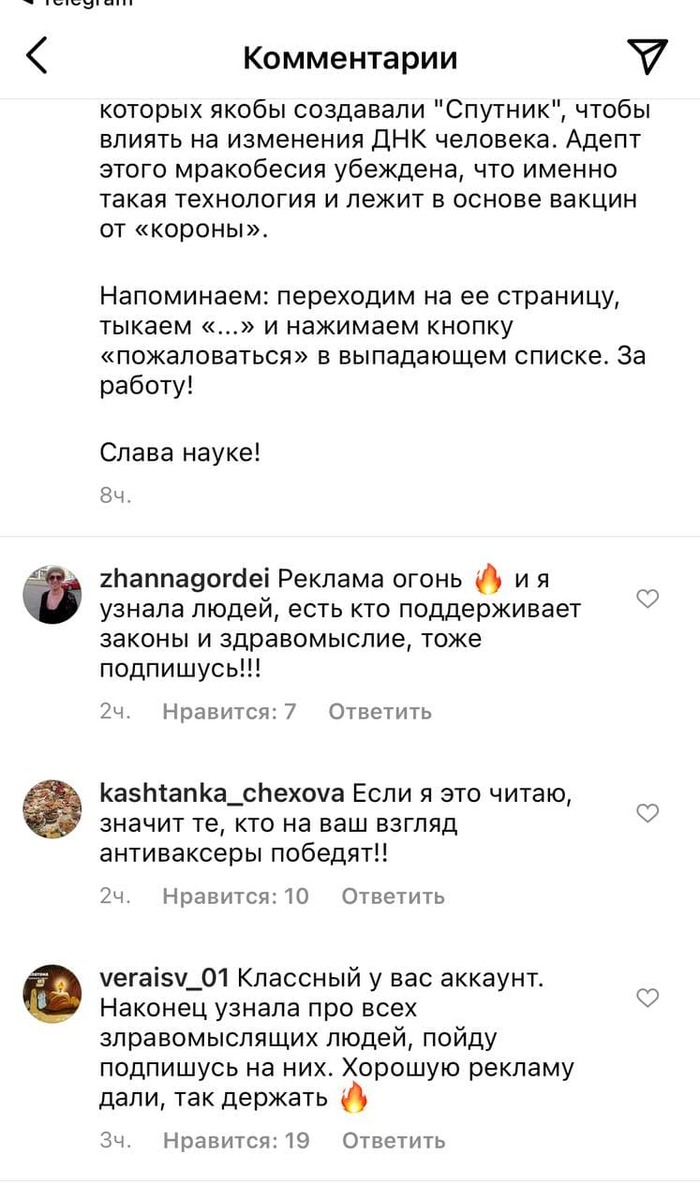 «Спасибо, что показали мне этого антиваксера, значит я на него подпишусь, потому что я сам такой». Очевидно, что основной концентрат сторонников движения в Телеграме.