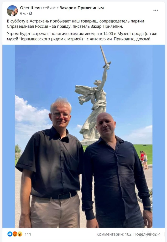 Оппозиционный депутат Олег Шеин решил на двух стульях усидеть и сфотографировался с Захаром Прилепиным, после чего словил волну хейта от своих потенциальных избирателей. Для них это выглядит, как человек левых взглядов Шеин в Волгограде обнимается с правым националистом Захаром Прилепиным прямо под карающим мечом Родины-Матери.
