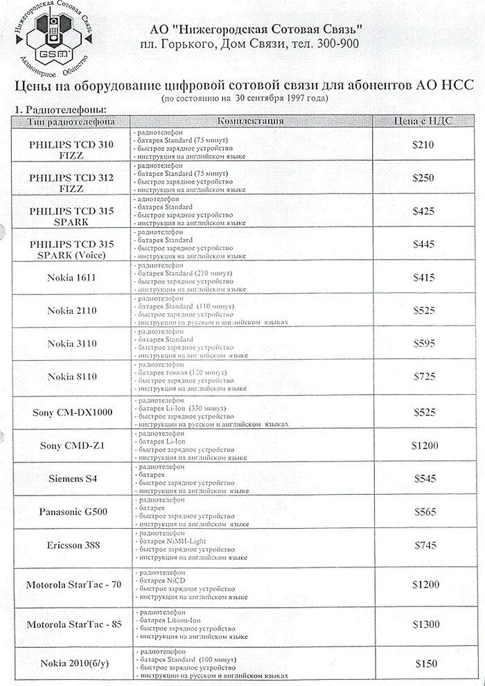 Ну и прайс-лист на сотовые телефоны тех лет. Замечу, что уже в то время все аппараты комплектовались быстрой зарядкой!!! А сейчас это фича :)