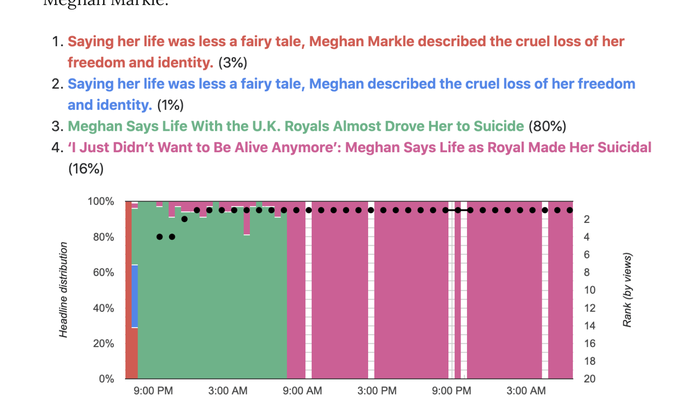 - Часто NYT начинает подтюнивать уже вышедшие в топ статьи, чтобы сделать их ещё убойнее. Самый яркий пример - как заголовок про Меган Маркл из "Её жизнь не была сказкой, она потеряла свободу и идентичность" превратился в "Жизнь в королевской семье почти довела меня до самоубийства".