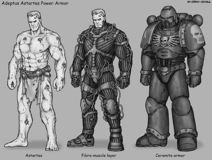 - Соединение в единое целое с бронёй. Встречается повсеместно, энергии варпа не позволяют десантнику покинуть доспех, соединяя моряка с бронёй. Ни помыться, ни посрать нормально, не ходите детки в варп, и с вами такого не случится