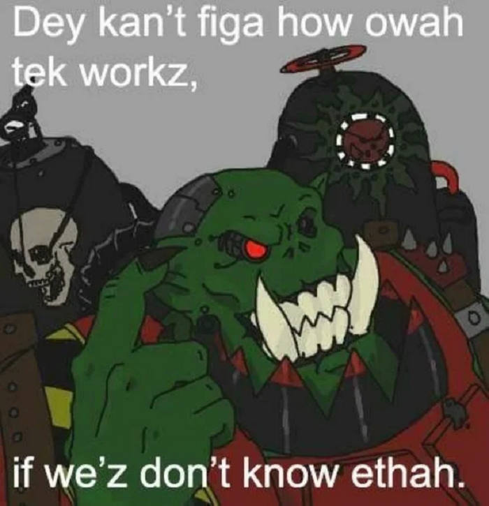 Ну вот и получается, что сами они сделать нихрена не могут, остаётся только отобрать у Империума. Есть ещё вариант обратиться к тёмным механикум предателям, но они бесплатно даже членом, который на механодендрите вырос не пошевелят. А заплатить им чем то надо. А попросят они например археотех. Или пару миллионов младенцев. Или геносемя для экспериментов. На край нужно будет кого нибудь для них убить.