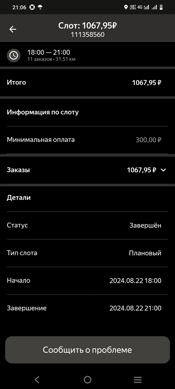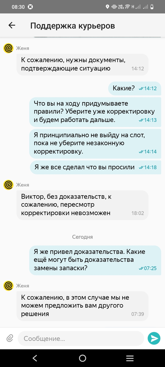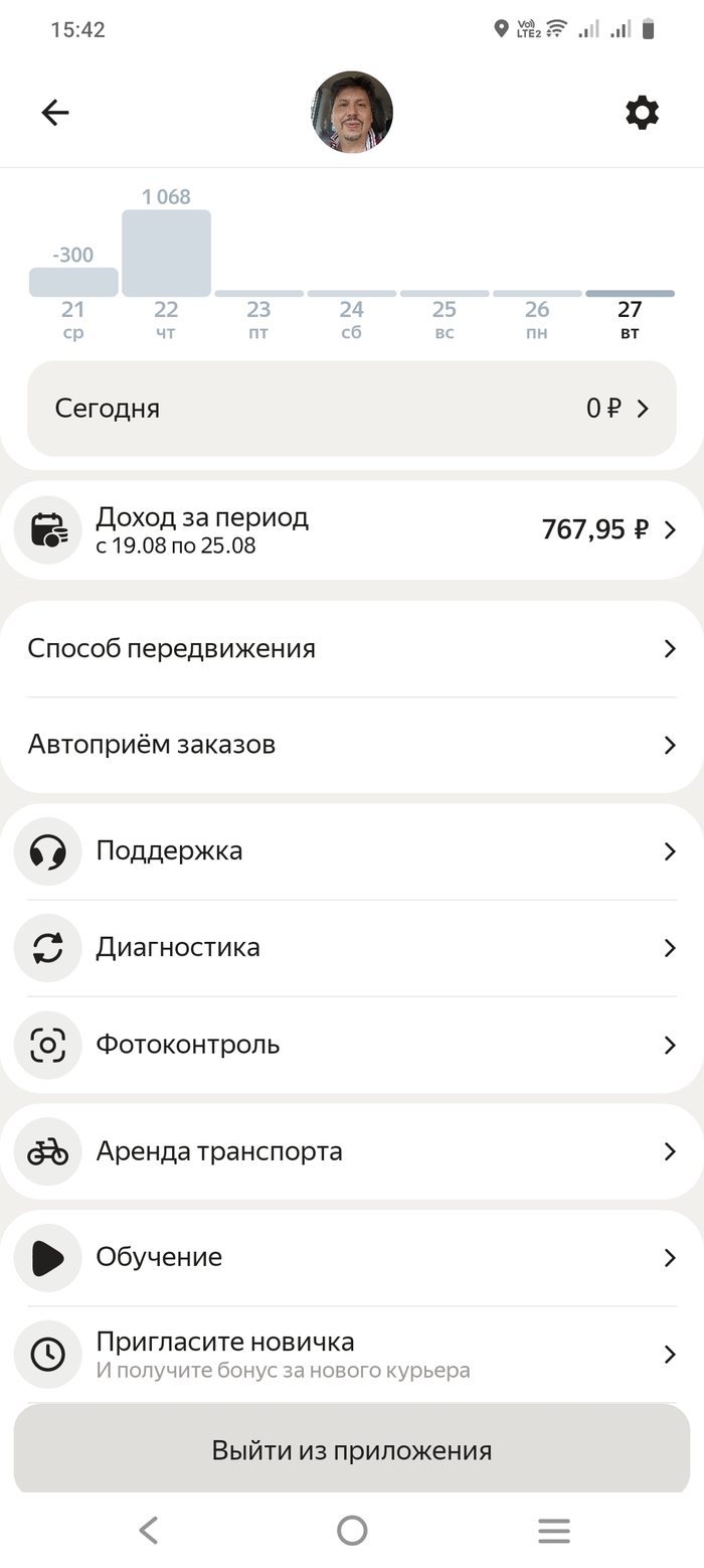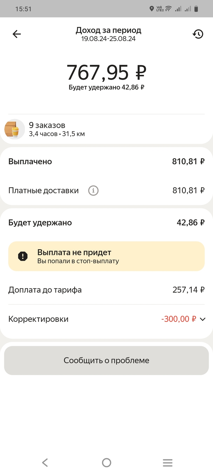 Поработал на следующий день (22 августа) - все нормально. Гляжу, а через день у меня корректировка (так в яндекс.еде называют штрафы) - минус 300 руб, за 21-е число стоит. Нормально? Так - то есть у меня и так убыток (из-за колеса) а меня еще и цинично за это штрафуют.