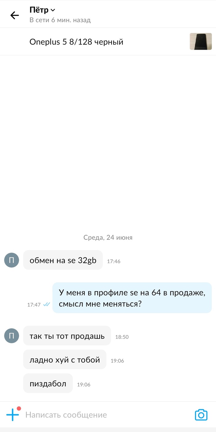 30 vfrcbvx Так ты свой продашь ... 5 лет назад Продаю пару телефонов на Авито, старенький OnePlus 5 и iPhone SE 64Gb (это важно)И вот пишет мне товарищ по объявлению op5что у людей в голове ... Показать полностью 1 [моё] Авито Неадекват Мат Скриншот Ещё 0
