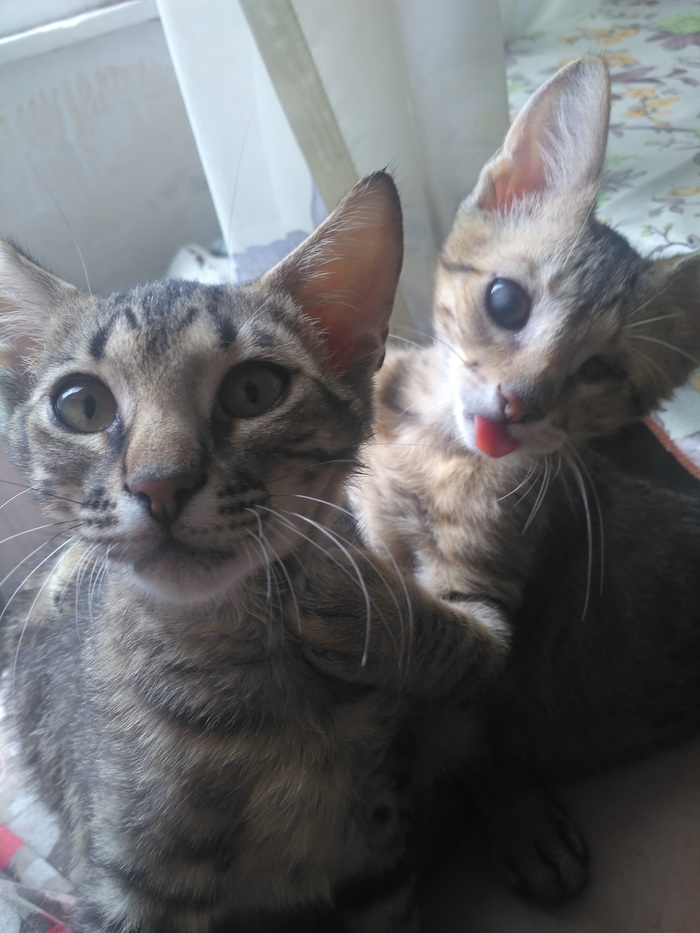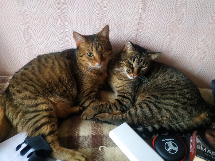 Сейчас им по четыре года, они толстые и важные. Но я люблю это фото. Они братья из одного выводка, у одного нет половины уха, у второго нет глаза, а вторым он плохо видит. Нет, если этого не знать, разницы с другим котом не видно. Жизни это никак не мешает.