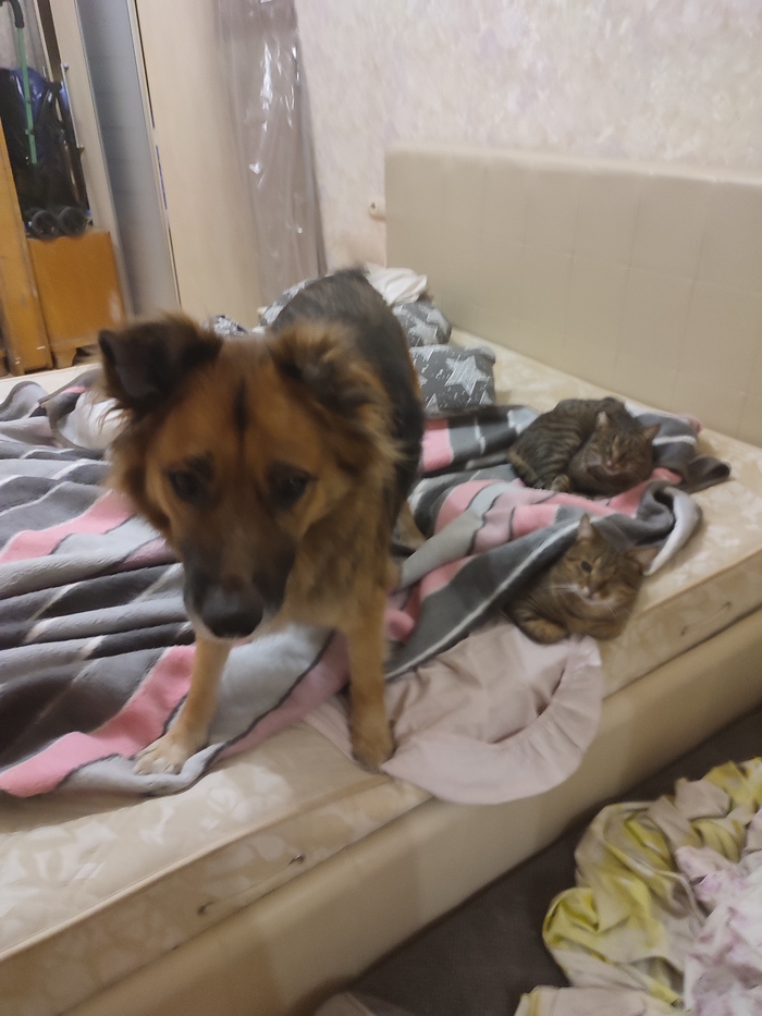 Прошел год. Сейчас у нас абсолютно ориентированная на своего человека адекватная и обучаемая собака, которой в радость учиться. Дома он ничего не испортил, метить диваны прекратил, отлично терпит выгул. Спит с котами. Сдает котов, когда они плохо себя ведут. У него ярко выраженный инстинкт пастуха и охранника и лидерские качества. В отпуске неделю жил у подруги на даче с четырьмя другими собаками и десятком коз - вот где собака была при деле. Он недоверчив к другим людям, имеет личные границы, но адекватен и не агрессивен. А ещё он потрясающе верный пёс. Полгода мы занимались с кинологом, сейчас пошли на площадку - с единственной целью, наладить контакт с другими собаками. Эта проблема пока не решена, но прогресс явный.