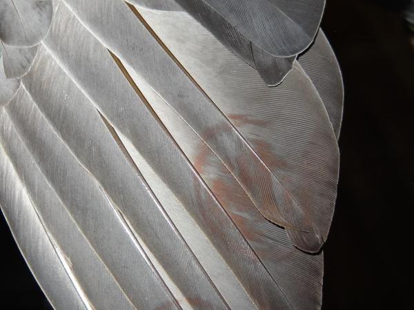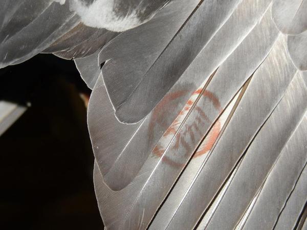 Оперение у новосела чистое, без печатей, так что если он из той же партии спортивных голубей, то участвует в соревнованиях впервые.