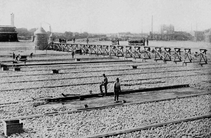 Первое фото - подготовка загрузки фильтра - доставка песка на площадку. Так как фильтр занимал большую площадь, то для быстрой доставки песка строилась микро железная дорога, по ней вагонетками рабочие вручную возили песок.