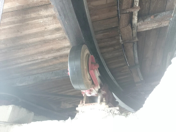 Скрытая от зрителей нижняя часть сцены. По периметру проложена кольцевая стальная балка, удерживающая платформу и опирающаяся на валики.
