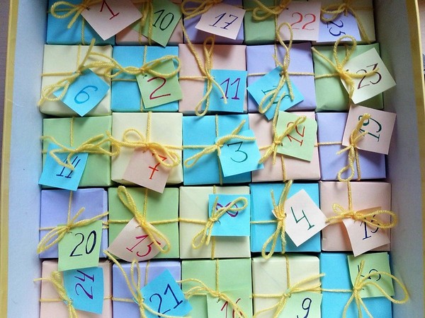 В итоге получается: двадцать пять (меньше или больше, а можете вообще не привязывать к возрасту) коробочек с разным (или одинаковым) содержимым, в одной из которых находится подарок.