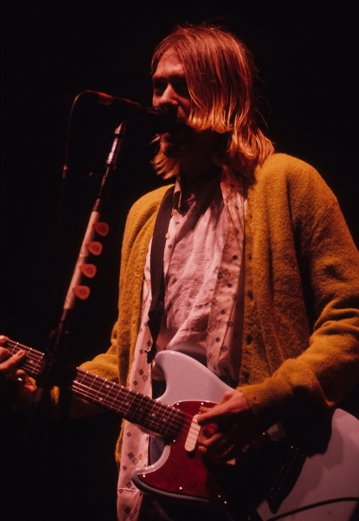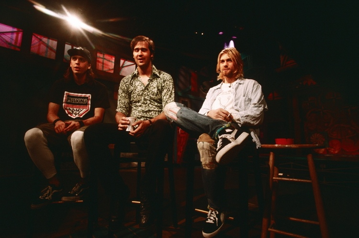 Ранее не публиковавшаяся фотография NIRVANA, сделанная в студии MTV в городе Нью-Йорке, США, 24 сентября 1993 года.Обновленная по качеству из ранее доступных в Сети фотография Курта Кобэйна, сделанная во время выступления NIRVANA в спорткомплексе "Patinoires du Littoral", город Невшатель, Швейцария, 19 февраля 1994 года.
