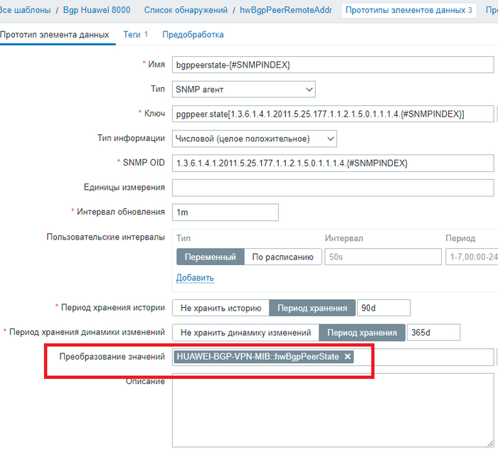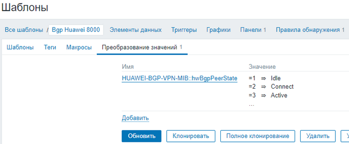 Исходный шаблон показывал соседей BGP (и не было понятно что это пир, только теги смотреть) и статус пира в виде строки с текстом от 1 до 6. Я, во-первых, коды наизусть не особо знаю, во-вторых, хотела бы график с изменением статуса пира, а график - он только для чисел, а не для текста. Также я не поняла зачем на фактически одни и те же пиры делать обнаружение и перетащила всё в одно «обнаружение», но сделала дополнительный «прототип данных» на статус пира.