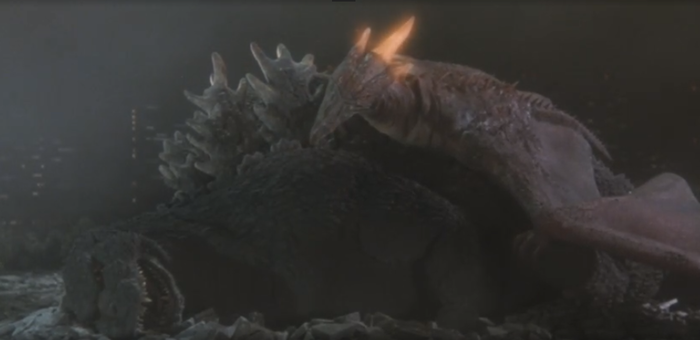 Летающая тварь которая весь фильм была против, прилетает, ее сбивает робот и она падает на годзиллу и отдает свои оставшиеся жизненные силы моей Годзилле!! ГОДЗИЛЛА ВОСКРЕСАЕТ!!!