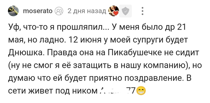 @moserato мы не имеем права публиковать персональные данные, так что Вы всё таки пригласите супругу ненадолго заглянуть за поздравлениями )