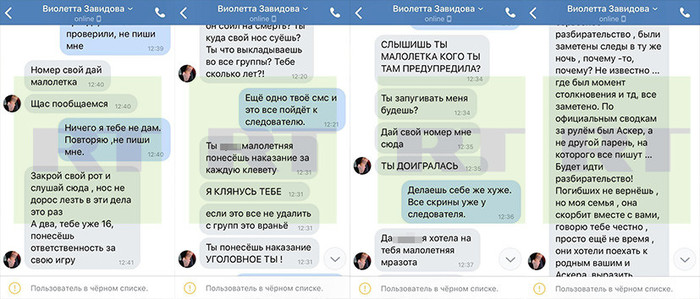 «Ты сука малолетняя понесёшь наказание за каждую клевету я клянусь тебе, — пишет Виолетта (орфография и пунктуация сохранены). — Ты доигралась… Тебе уже 16, понесёшь ответственность за свою игру».