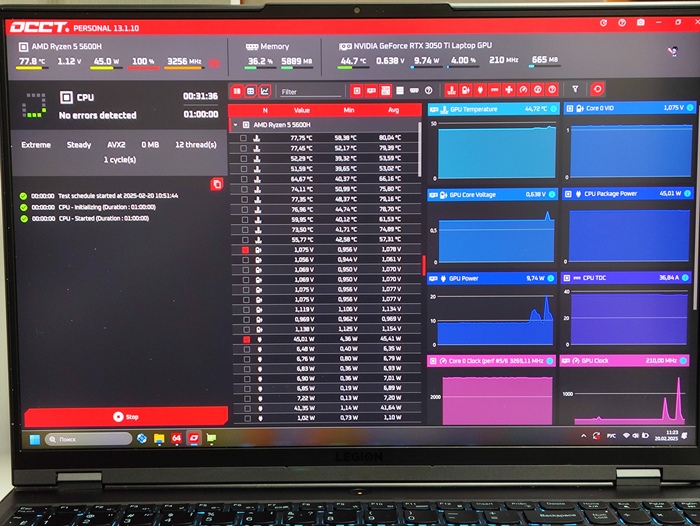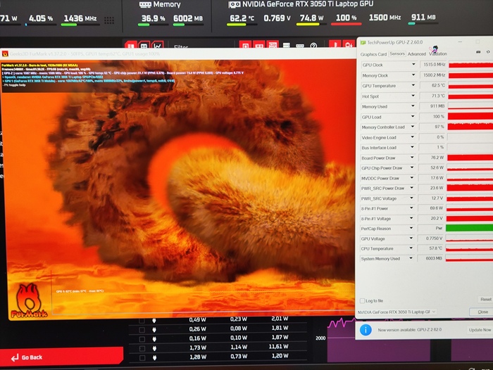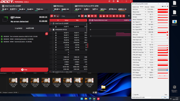 Суперпозишн, ожидаемо, выдал такое же количество баллов (ведь если нет упора в видеопамять - производительность гпу не изменилась). Мониторинг работает верно, отслеживаются обороты турбины, потребление в 450вт - нормально для 4090.