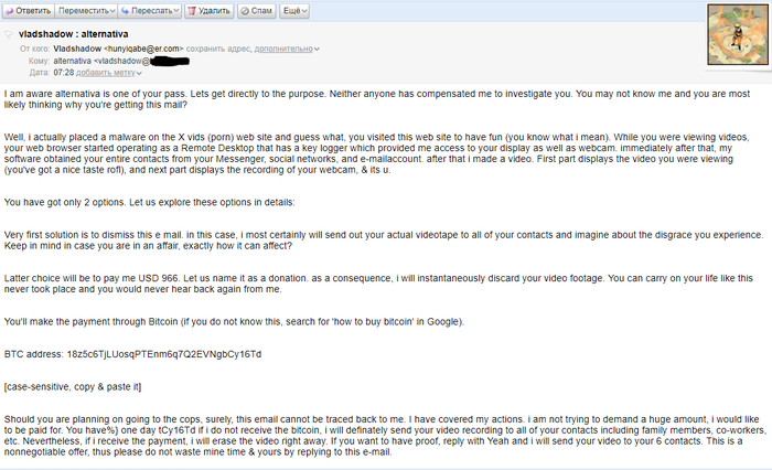 Если вкратце, некий хакер установил на мой компьютер шпиона, и следил за мной.Взломав мой роутер (которого нет) и сделав снимок с веб камеры (которая валяется на полочке), обязуется выложить места посещений порно сайтов (о боже мой, какая досада) по моим контактам., и просит выкуп в биткоинах (какая наивность)