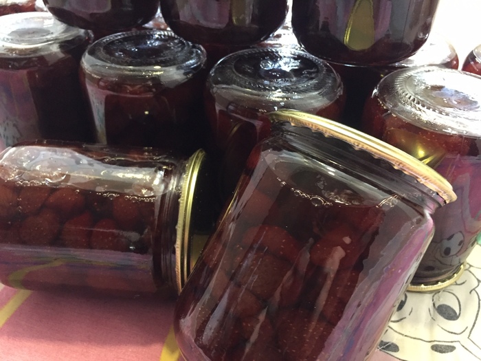 Клубничку сами выращиваем, прошлым годом было не много кустов клубники, в этом году рассадили больше. Вообще-то варю много разного варенья, да, да именно я варю варенье, жена этим не занимается. В эту субботу будем еще клубнику снимать, но пошла жара и мошка, и это будет тихий ужас.