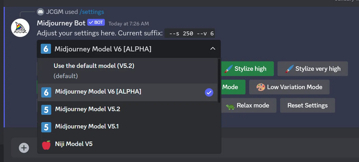 Если вы являетесь пользователем Midjourney, то по умолчанию в Discord используется модель изображения V5.2, а не V6. Чтобы включить модель V6, откройте страницу настроек с помощью команды /settings.