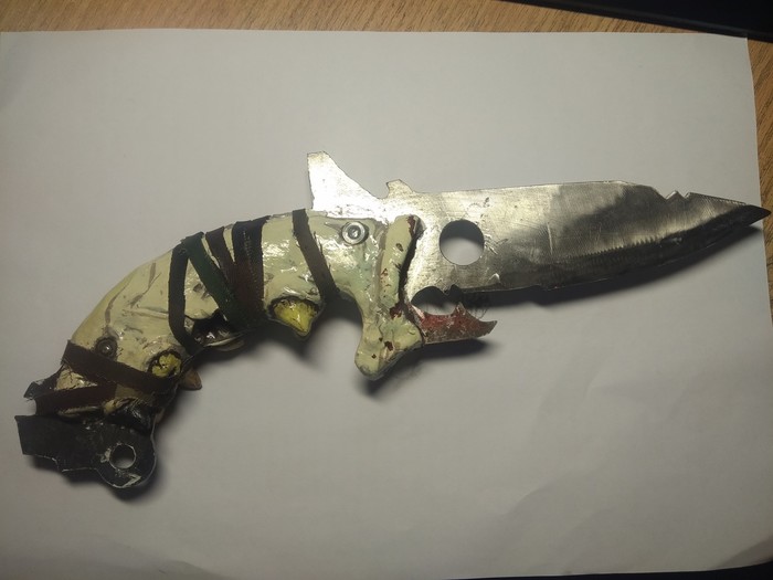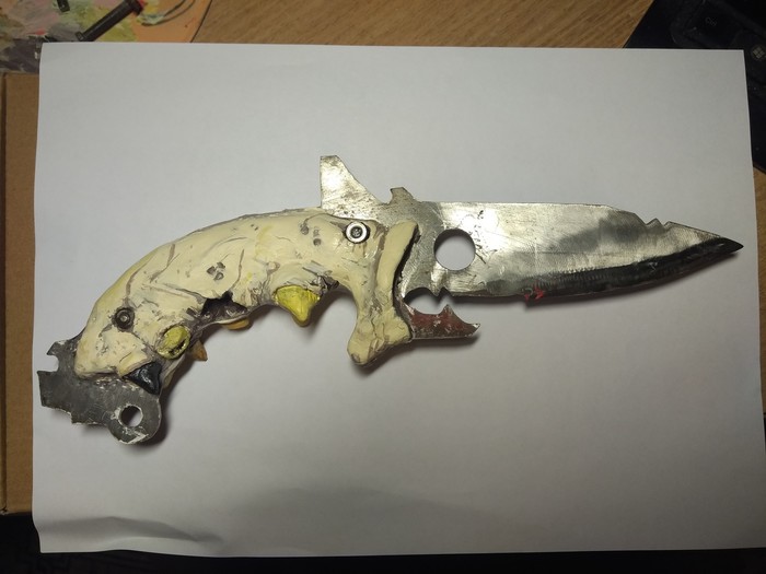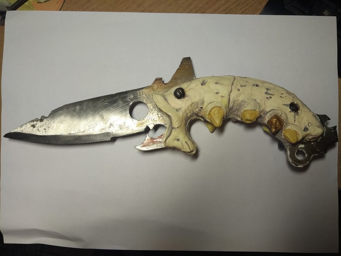 Вот, последний вариант. По-моему, выглядит достойно. Куча встроенных открывашек, острое лезвие, в руке лежит, как ни странно, неплохо - старался сделать зубы удобно.