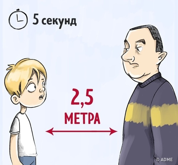 Ребенок должен знать, что незнакомцы могут заболтать не только детей, но и взрослых, поэтому важно быстро уйти в безопасное место уже через 5–7 секунд после начала разговора. Следует стоять от незнакомца на расстоянии 2–2,5 метров; если он приближается, нужно делать шаг назад. Вместе с ребенком отрепетируйте эту ситуацию, покажите дистанцию в 2 метра и предупредите, что во время беседы ее нужно сохранять.