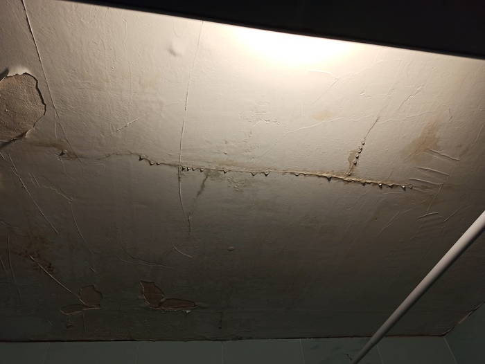 Из-за того, что у соседа сверху постоянная влажность в санузле, у меня на потолке штукатурка трескается и отваливается. Из-за частых протечек в самой плите уже "проторенные" дорожки и вода стекает в определенных местах.
