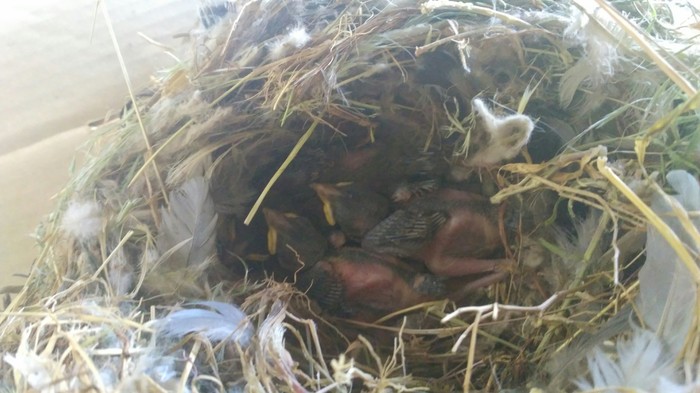 Вытаскивали на работе оконники, на одном было гнездо, чудом не упавшее вниз. Часть гнезда пострадала, поэтому собрали его с половиной другого гнезда, которое тоже было на другом оконнике (пустое). Сделали под дно дощечку, чтобы не свалились, и наблюдаем). Родители прилетали, кормили.