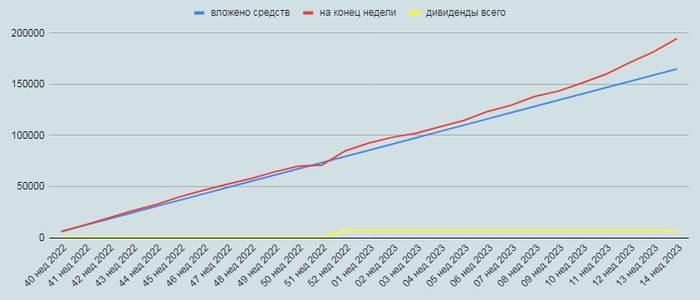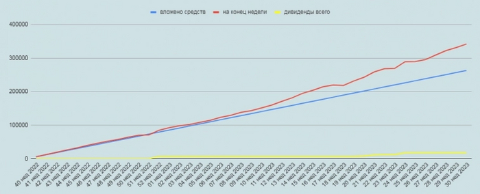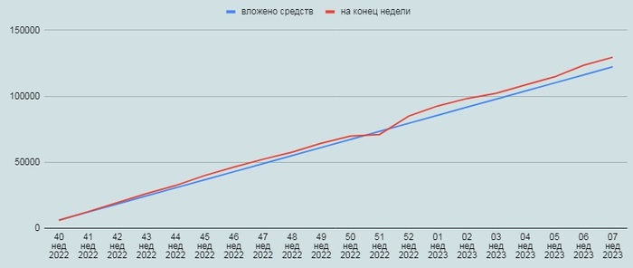 Это распределение долей в портфеле "выкупим рынок сами". А это кривые вложенных средств и итоговой стоимости портфеля на конец 7 недели 2023 года: