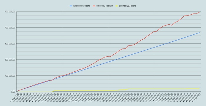 Цель портфеля не похвастаться или привлечь подписчиков, али заработка. По-настоящему он создавался для проверки теории, в которой говорится о достаточности непрерывного инвестирования для достижения финансовой свободы. Сумма по голосованию была выбрана более-менее средняя для России - 6113 рублей. Она добавляется в этот портфель еженедельно. Дивиденды не изымаются, а докапитализируют портфель, наращивая таким образом сложный процент.
