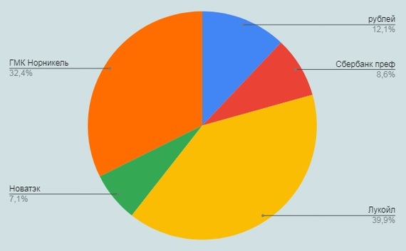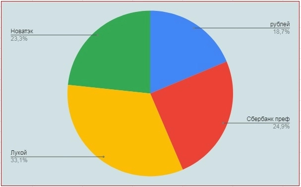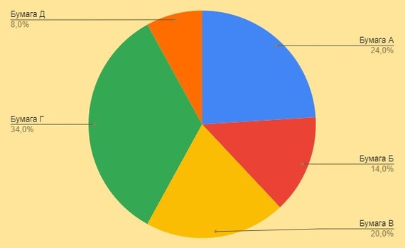 Однако свойство ценных бумаг в том, что какие-то падают, какие-то растут, а некоторые могут оставаться на месте. Вот по одной из стратегий вам следует постоянно поддерживать соотношение бумаг в портфеле. Предположим, прошёл квартал и соотн7ошение бумаг изменилось вот таким образом: