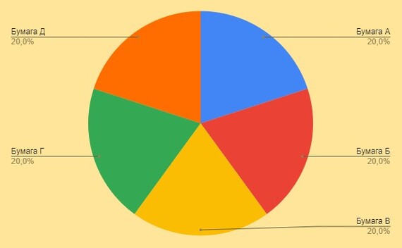 Далее вам предлагают немного иной способ. Суть его такова, что вы определяет количество бумаг в вашем портфеле, и их долю. Далее, еженедельно, ежемесячно или ежеквартально, а иногда и раз в год, вы перетряхиваете этот портфель, возвращая его к первоначальному виду. Что это значит. Предположим, в портфель вы выбрали 5 ценных бумаг по 20% каждую. Выглядеть это будет примерно так: