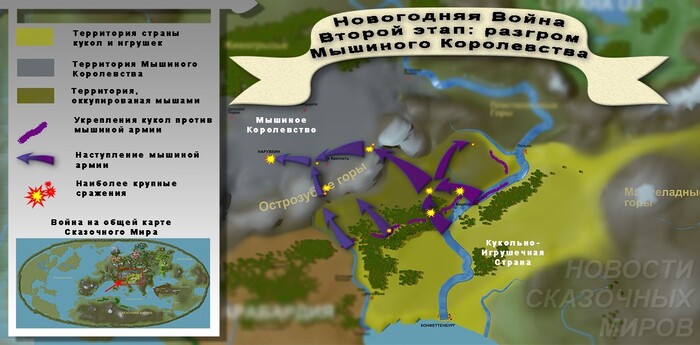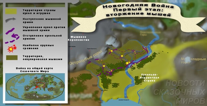 Надо сказать, что мировая сказочная общественность очень внимательно следила за ходом боевых действий в развернувшейся большой войне. Поначалу большинство военных экспертов и политиков всех стран, хотя и сочувствовали кукло-игрушкам, но всё-таки предрекали им поражение, потому что считали, что мышиная армия сильнее и опытнее кукольной. Однако же постепенно, по мере нарастания сопротивления кукольно-игрушечного народа, они начали с удивлением признавать, что куклы очень быстро учатся воевать, и всё ещё может быть не так однозначно в этой войне.