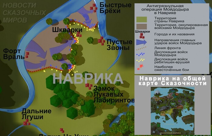 Однако ребятишки-вруши неожиданно оказали сильное сопротивление войскам ННУ, и операция затянулась. Кроме того, ряд государств (в первую очередь Хулиганистый Союз*) обвинили Мойдодыра в агрессии против свободного народа врушей и стали оказывать военную и экономическую помощь Наврике. Так что объявленная противогрязнульная операция не просто затянулась, но и фактически превратилась в самую настоящую войну, где против войск ННУ сражаются не только вруши, но и многочисленные отряды добровольцев из других стран.