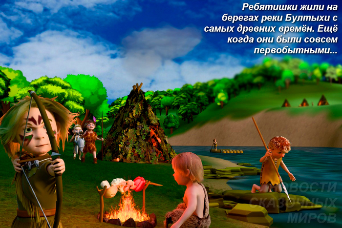 Жили древние сказочные ребятишки, в общем-то, как и все древние сказкожители*: строили шалаши, ловили рыбу, охотились с луками на всяких местных животных. Постепенно их становилось всё больше, и они заселили достаточно обширные земли по западному берегу реки Бултыха - те земли, на которых нынче располагается страна Пионерия*.