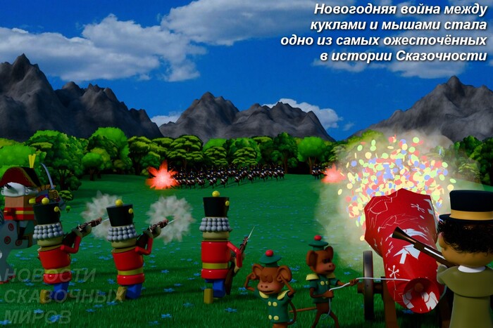 А в новогоднюю ночь, когда в Сказочной Реальности наступал 1817 год, волшебники-новогодники* из Лапландии* объявили о продлении режима новогодних чудес не только на ближайшую новогоднюю ночь, но и на всё время войны, которая шла между куклами и мышами. Это был совершенно невиданный в истории Сказочной Реальности* такой случай волшебства*, ради которого дед-морозы, санта-клаусы и прочие новогодники совместными усилиями разработали целую серию уникальных и очень сложных заклинаний, которыми поддерживали новогодний режим целых два года! Благодаря такому новогоднему режиму чудес куклы ещё сильнее поверили в свои силы. Их сабли стали ещё острее, коняшки ещё быстрее, а поставляемые из Страны Ёлочных Игрушек пушки-хлопушки стали стрелять ещё дальше!..