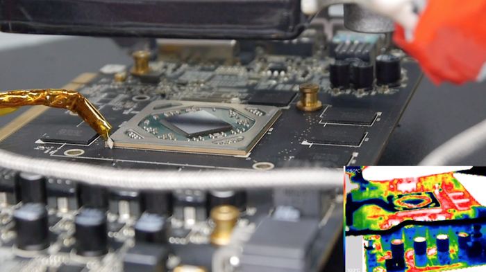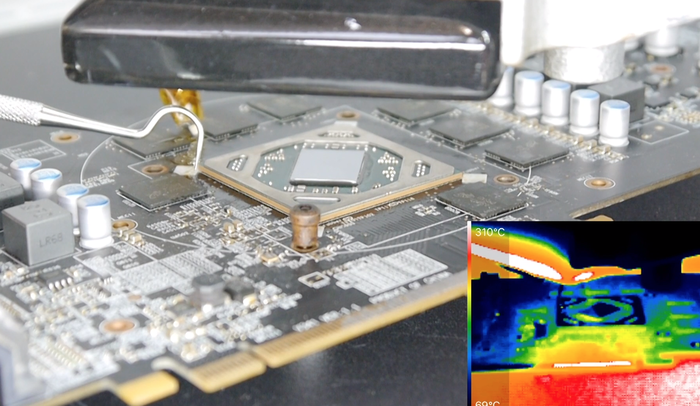 На нем вы можете увидеть небольшую группу конденсаторов, которые "сожрал" жидкий металл.