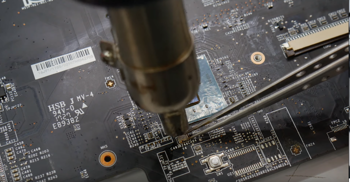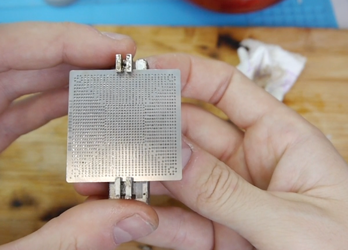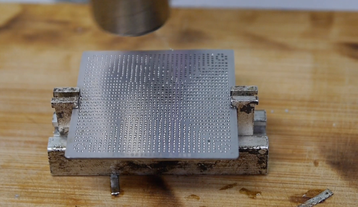 Достаем плату донор, залуживаем все контакты сплавом розе, не жалеем и не бойтесь что контакты слипнуться. Далее переворачиваем плату и феном примерно в 450 градусов прогреваем обратную сторону.