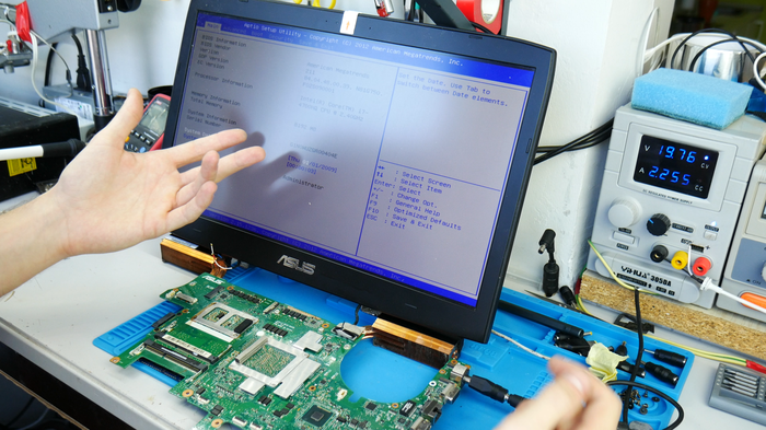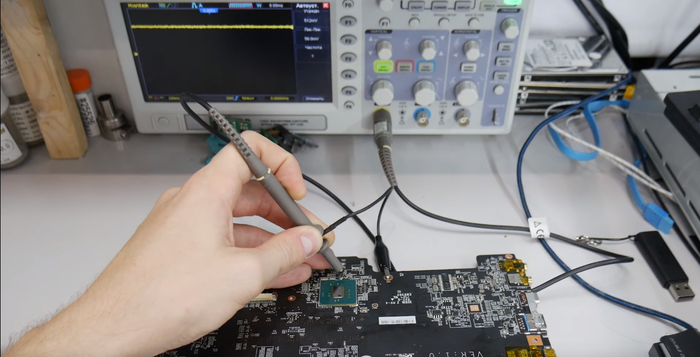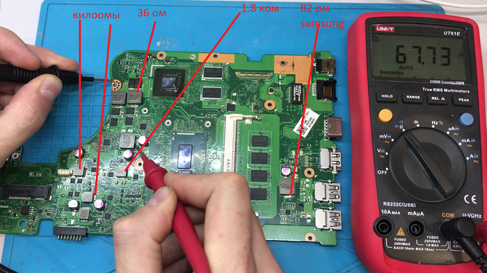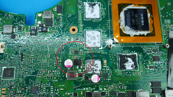 Но для начала проходимся по всем основным фазам питания, и к счастью не находим ничего подозрительного.После перепайки этих конденсаторов аппарат включился, и спустя 4 минуты сброса биоса дал картинку, но радость моя была не долгой, ведь оказалось что у нас не работает один из 2 слотов под оперативную память, клиент перед отправкой так же упомянул что заметил так же жм между контактами озу и старался его оттуда удалить.