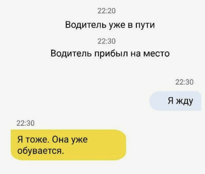 20 wagonmoi 1 год назад Хорошо, что сейчас отмена в таких случаях платная для пассажира Показать полностью 1 Скриншот Такси Юмор Таксист Чат Ещё 0