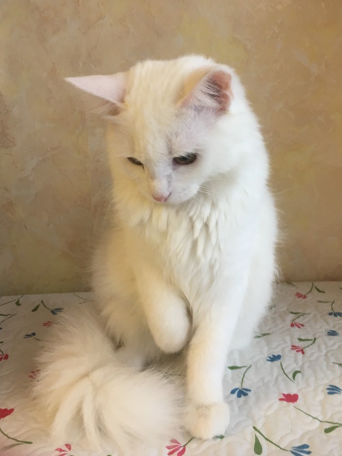 Возвращаясь вечером домой с работы , увидели, что на лестничной площадке в углу сидит белый пушистый домашний кот. Как нас увидел - сразу начал об ноги тереться, мурчать-фырчать, проситься, в общем. Так как квартира съемная, решили на ночь его в коробку поселить, и, если утром хозяин не объявится, забрать на передержку.