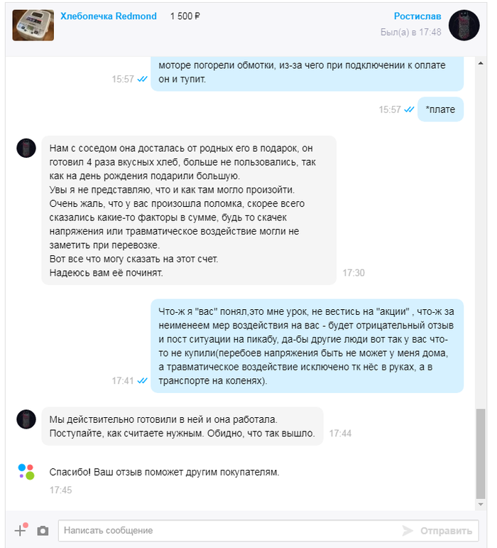 Отсюда урок - не верьте на слово, а если есть возможность проверяйте на месте, если не дают такой возможности - разворачивайтесь и уходите (да понимаю, в случае хлебопечки вам врятли дадут возможность испечь хлеб).
