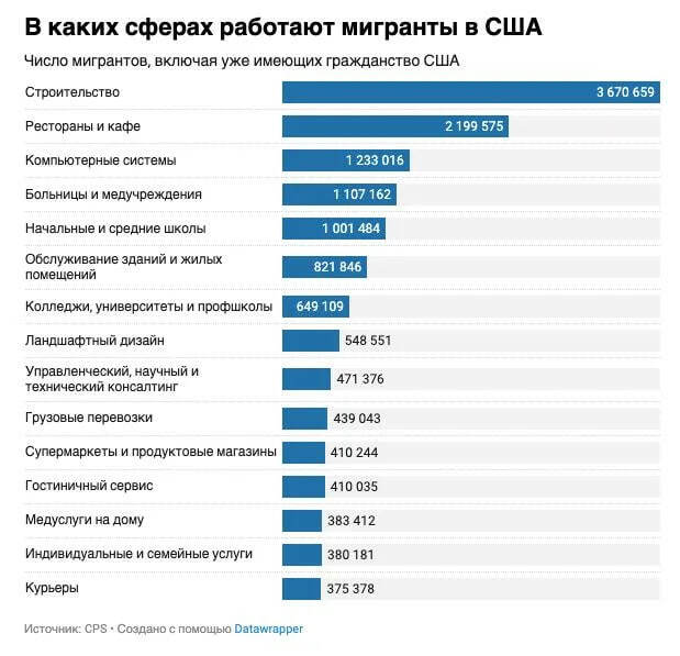 А там, внезапно, сферы занятости приезжих совсем другие. Если со строительством и общепитом на первых двух строчках всё понятно, то, например, на третьем месте в США не водители, как у нас, а специалисты компьютерных систем.