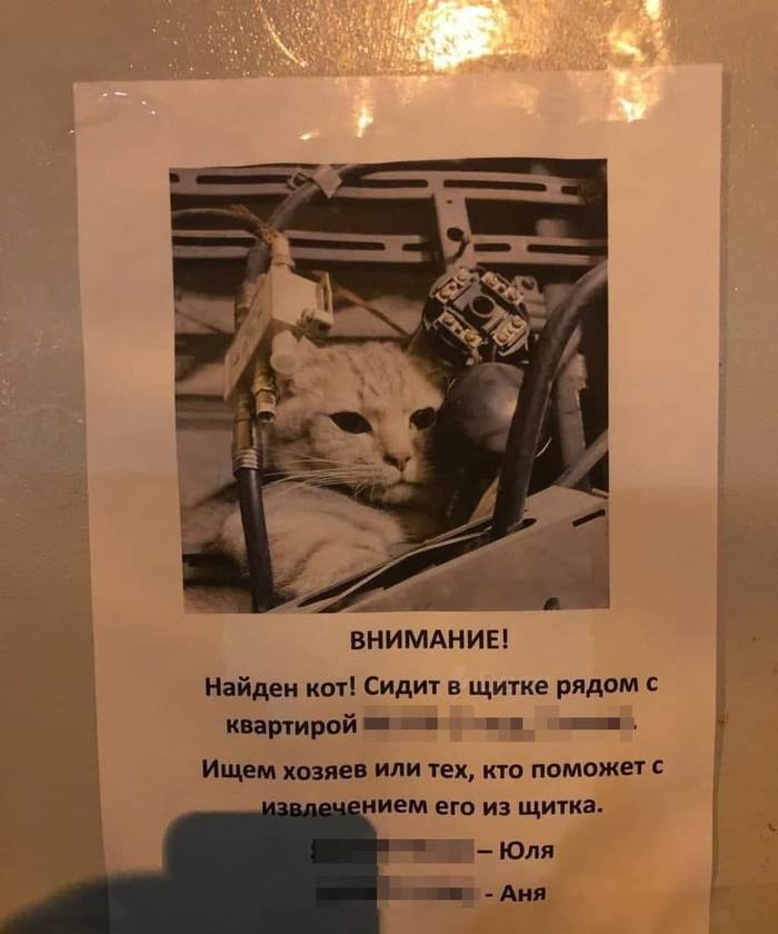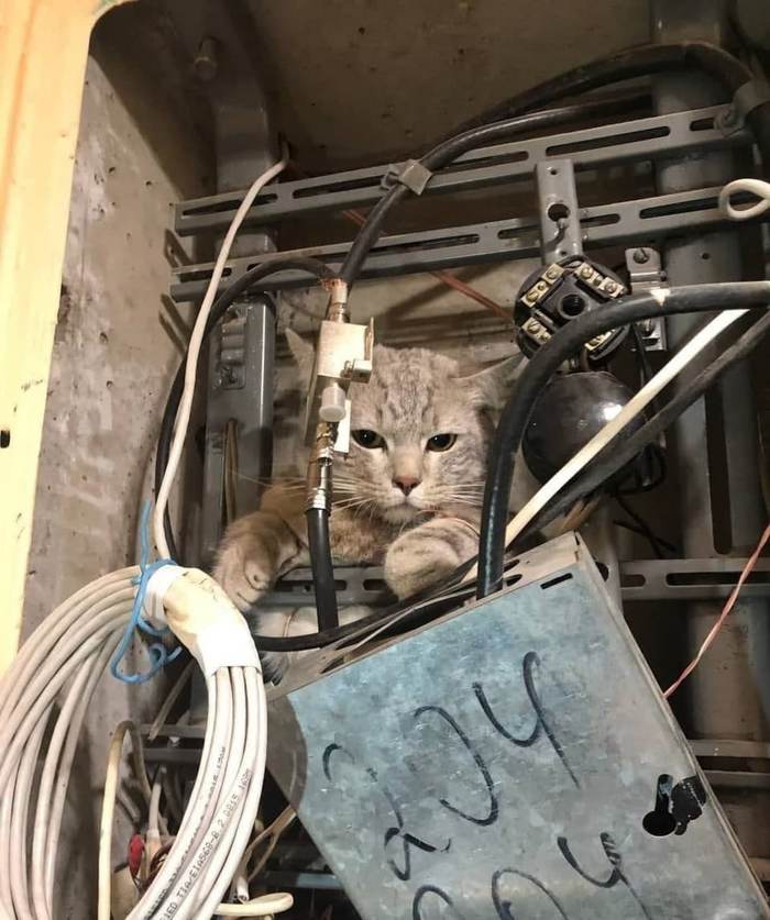 Кот забежал в подъезд несколько дней назад и спрятался в распределительном щитке. Жители отключили распределитель, чтобы кота не убило током, и стали искать его хозяина или "того, кто поможет с извлечением из щитка".