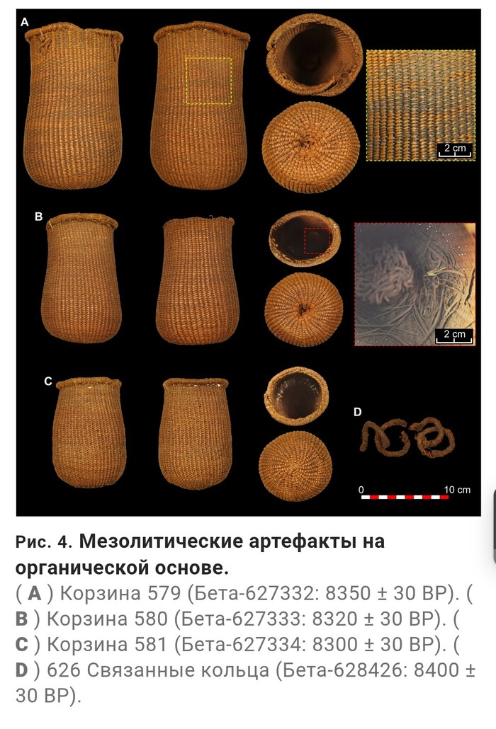 Корзины 579, 580, 581– трёхмерные корзины, изготовлены из «необработанного» эспарто( вид ковыля, используется в плетении и сейчас), и обработанного. Украшены геометрическими мотивами из окрашенных волокон ( стоит заметить, геометрические назвал условно, для упрощённого понимания. Далеко не всегда, рисунки –узоры, носили строго геометрический характер. В отличии от современности). В плетении «участвуют» человеческие волосы ( Жуть, правда? Но ничего страшного, в 21в. видели и похуже). Эпоха мезолит ( охотники – собиратели). Датировка: 7680– 7360 гг. до н.э.. Тип плетения: простое( используется сейчас) диагональное скручивание(плетение когда из основ выбирается пара листьев, которые чередуются друг с другом, создавая диагональный узор ,не используется из-за высокой сложности. Плетение по упрощённой схеме используется и сейчас) , спиральное скручивание( используется редко,, плетение, когда основа переходит в стяжек–не используется , из-за высокой сложности ), плетение « кофр» ( используется). Простое плетение и кофр обнаружены в отпечатках корзин на кусках глины на стоянке Ковес–де–Санта–Майра( 12 900– 10 200 гг. до н.э)., И в США ( примерно тот же возраст).