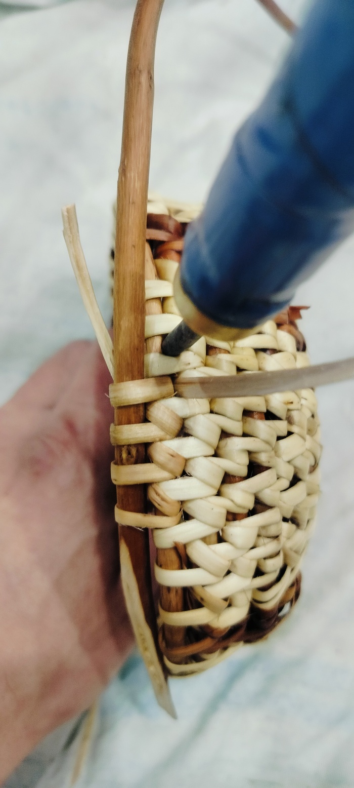 Далее заплетаем второй, третий и т.д.. Соединение обручей( стыки) разносим в разные стороны. По высоте, я подниму не много, на четыре кольца .Работа простая, но очень монотонная.