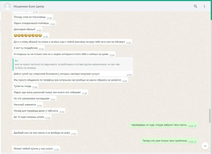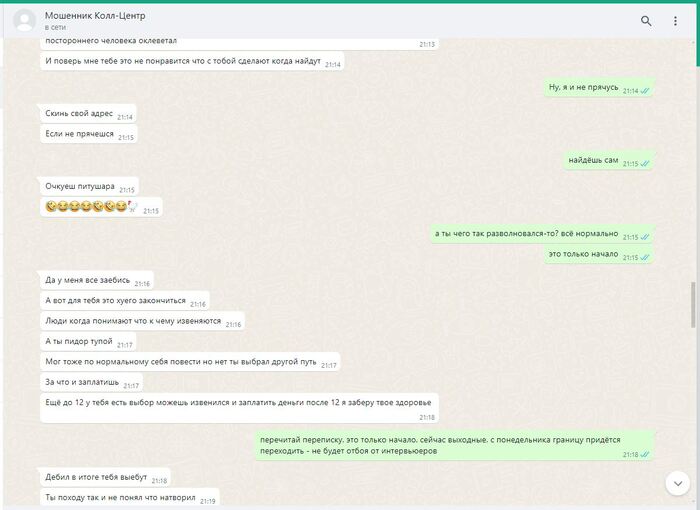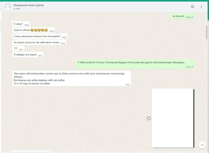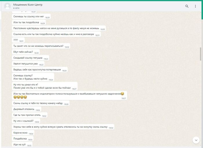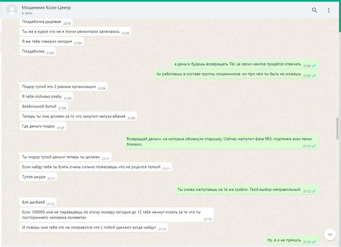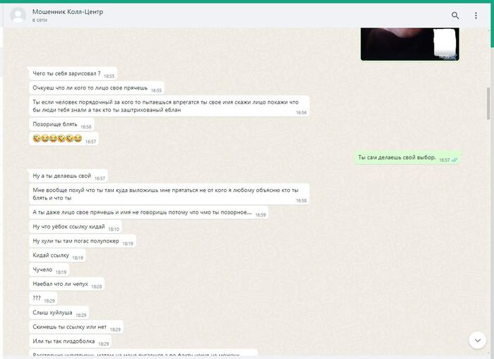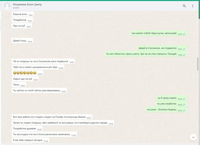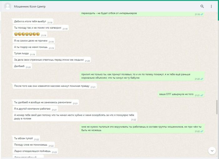 ПИКАБУ решает удалить редкие фото смоленского "РАШПИЛЯ" @666ks, работающего удалённо, из-за якобы недостаточности улик. А ведь какого труда стоило его вот так подловить. Всех операторов телефонной линии в подобных шарагах инструктируют особым образом: неужто вы считаете, что они будут в разговорах с нами наперегонки признаваться в том, чем они в действительности занимаются?! Я полагаю, что материала на него было более чем достаточно. Он вовсе и не отрицал, что знает какую деятельность ведут полевые сотрудники, что они обманывают людей. Просто в силу его интеллектуальных способностей ему казалось, что разграничение обязанностей полностью исключает для него все риски. А тут вот такое. Пришлось вылезать из норы, держать оборону. Другие его коллеги более осторожны, менее болтливы, более сдержанны. Работают они в составе группы мошенников, обманывают/навязывают/вымогают деньги у незащищённых слоёв населения. Их всех нужно ловить, вытаскивать на свет. Тогда они хотя бы чего-то начнут бояться.