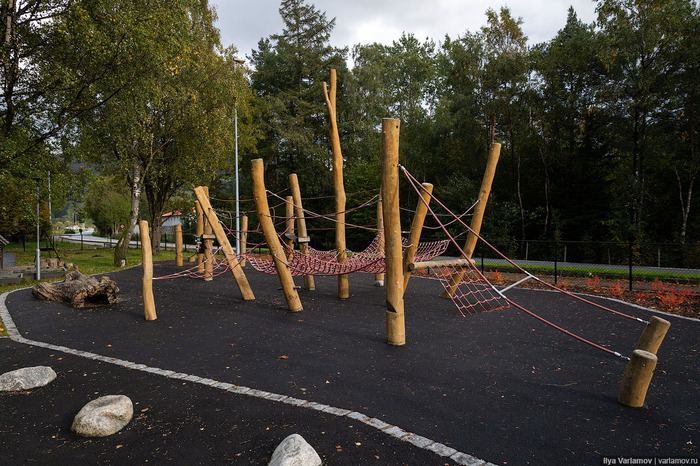 Детям, конечно, этого было недостаточно, они начали усложнять аттракционы: для нормального развития им необходим риск, и они получат его любыми возможными способами. Им, например, надоедает скатываться с горки, и они начинают на нее забегать задом наперед. Или залезают на крышу грибка и прыгают оттуда, пока взрослые не видят. Или прыгают с качелей. К счастью, в Норвегии поверхность под качелями – песчаная, а в песок приятно приземляться, но, например, в Британии качели ставят на гаревую поверхность, чтобы дети с них вообще не прыгали. Разумеется, не помогает.