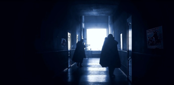 А иногда приходилось заменять слишком не аутентичные объекты, как дверь на следующем кадре. К сожалению, использовать хромакей не было возможности, поэтому пришлось почти покадрово обводить актёров на всех кадрах, где они пересекают дверь, что оказалось довольно утомительной и нудной работой.