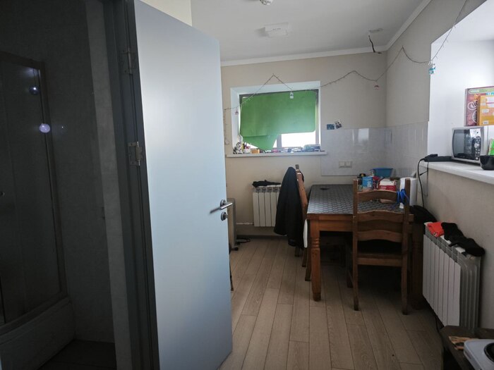 Квартира для сотрудников. Наша комната, где мы кушаем, отдыхаем, что-то обсуждаем и т.д. Никто там не живет, но есть все для комфортной ночевки в питомнике при необходимости. Кровать, душ, микроволновка... Бывали случаи в непогоду, когда собак буквально за пару часов заметало снегом. В такие дни для контроля ситуации кто-то из нас оставался иногда в питомнике ночевать.